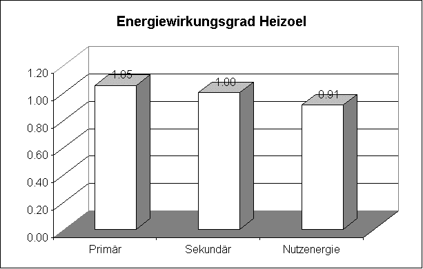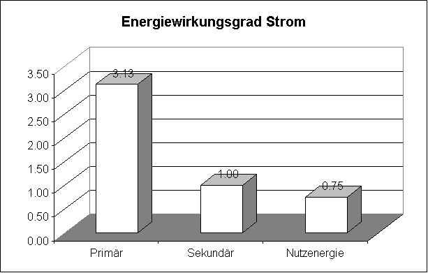 Auch die Nutzenenergie kann vielfälltig sein. Mit Strom kann ein Elektromotor angetrieben oder Licht erzeugt werden. Der Wirkungsgrad von Sekundärenergie zu Primärenergie wird in Europa durch die UCTE (Union for the Co-ordination of Transmission of Electricity) festgelegt. Andere Kalkulationen z.B. mit 3.05 in Abhängigkeit der Primärenergieträger finden Sie hier. (www.esu-services.ch)